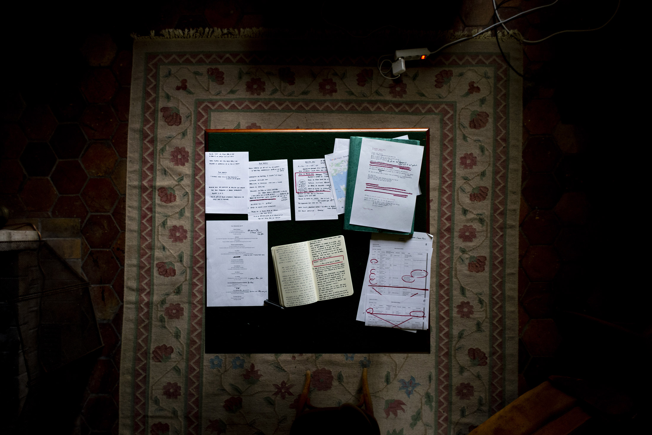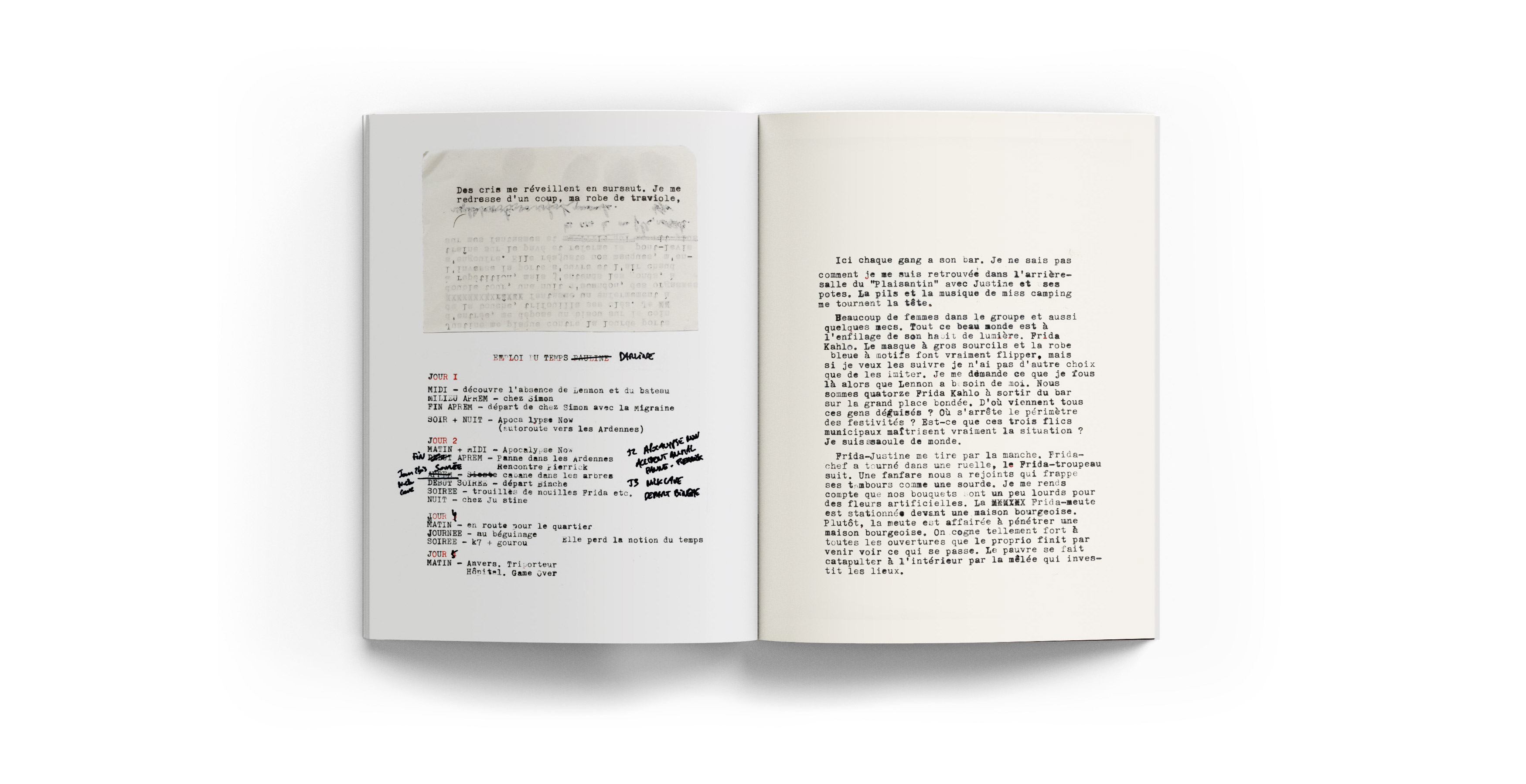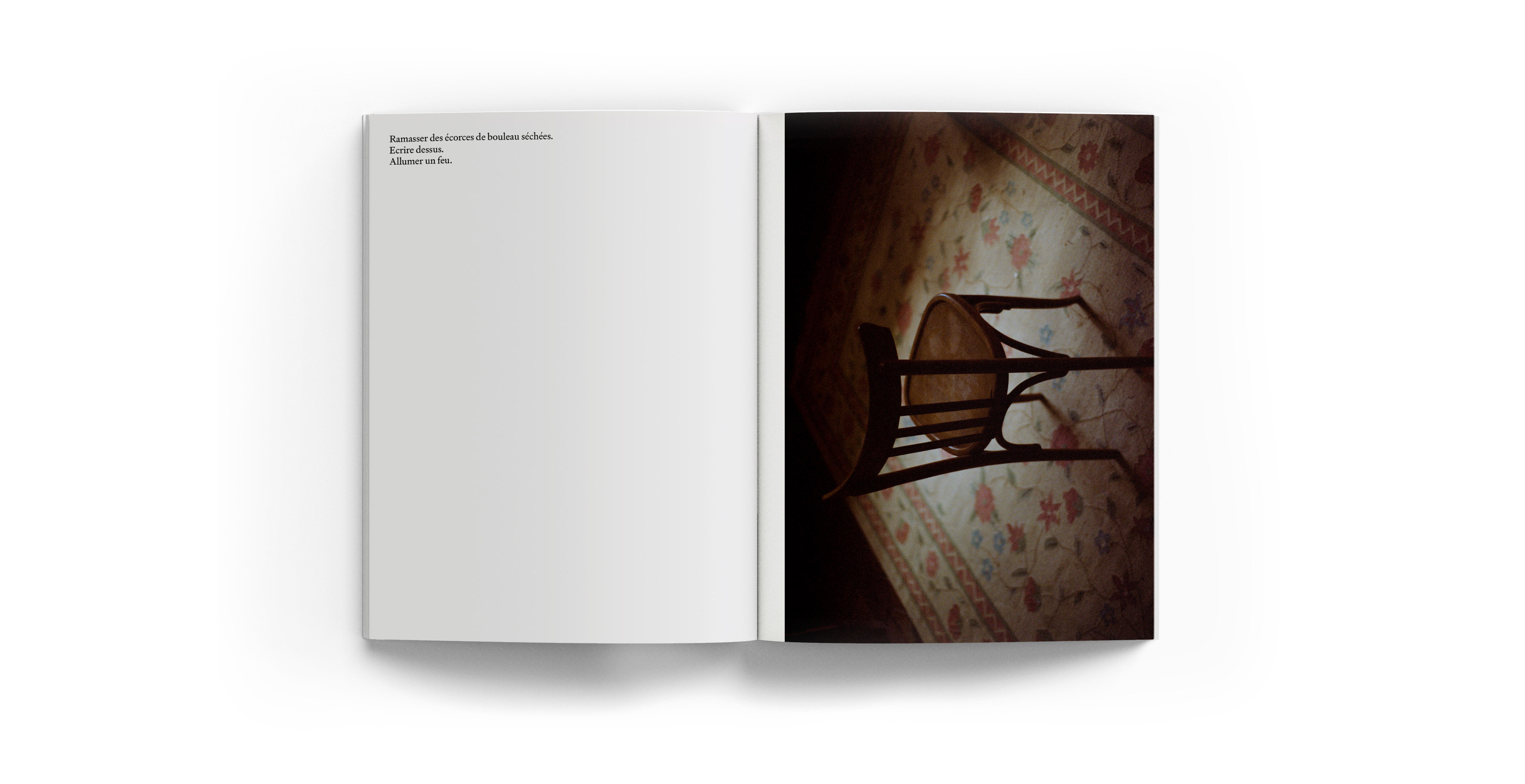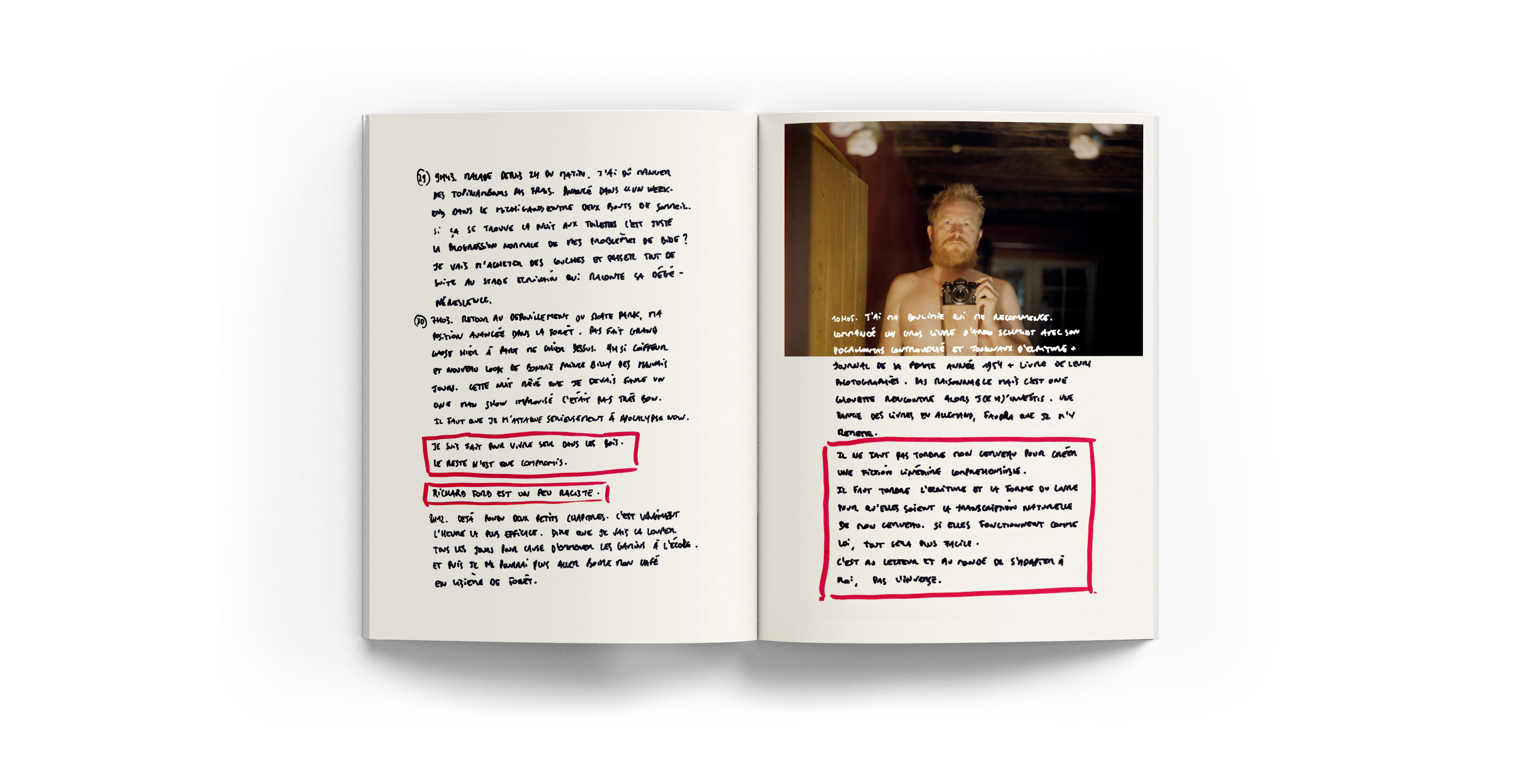 Les notes et tapuscrits extraits des archives de l’auteur, qui encadrent la série, sont principalement issus d’un journal de résidence en forêt et documentent autant « l’effet cabane » sur l’écrivain que le processus de création.